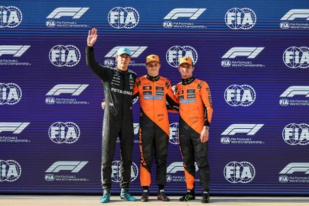 | Chinese GP Pole sitter Piastri (Middle), frontrunner George Russell starting P2 (Left), and current Drivers' leader Lando Norris starting from P3 (Right). Photo Credit: NurPhoto / Getty Images |
